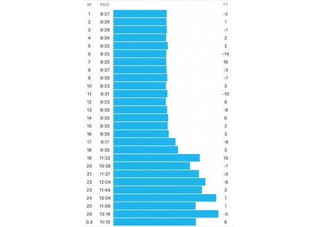 I got my pacing for the first 16 miles virtuously bang on, all within seconds of each other & the 8:30 target. This is a skill I have been working hard on on my flatter training runs (impossible on the hills!) & have been trying to master for many years!