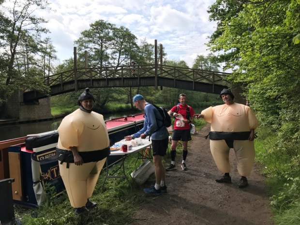 At the crossing of the River Wey just outside Guildford was the Bacon Barge, two guys who voluntarily set up an unofficial ‘bacon’ aid station every year, this year dressed as sumo wrestlers. A little bit of online banter pre-race hadn’t resulted in any facon for us vegetarians but there were some very welcome potato wedges & a lifting of spirits as we all smiled & laughed as we ran through.