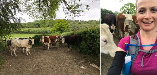 At the base of the next hill section I was running in a spread out group of about five other runners. As we turned a corner to be greeted by six or seven cows standing in front of the gate we needed to go through I was very glad I wasn’t alone! I was brave. I walked on through. I even tried to take a selfie with one but she seemed more interested in the sandwiches that were in my bag than in posing with me!