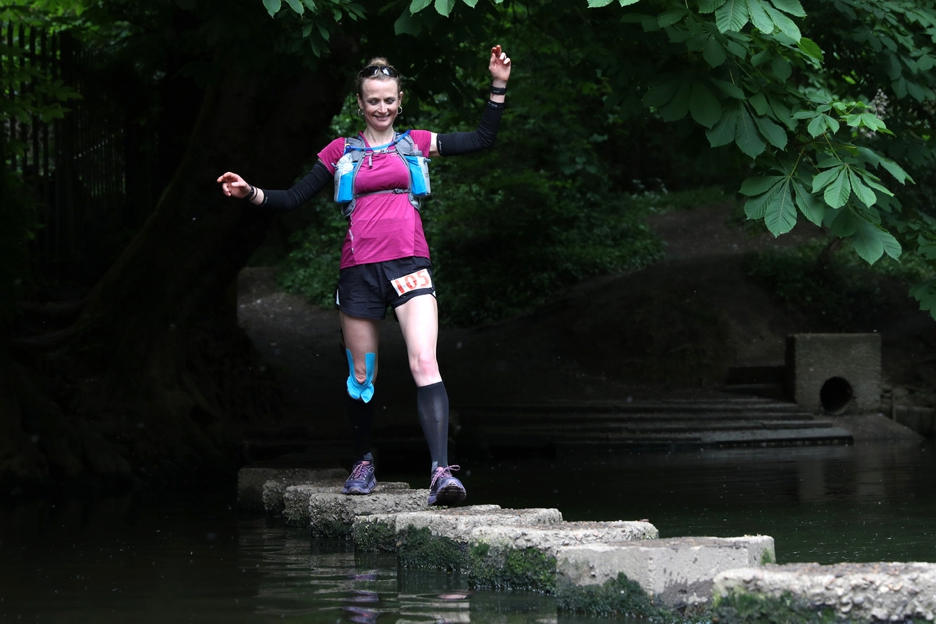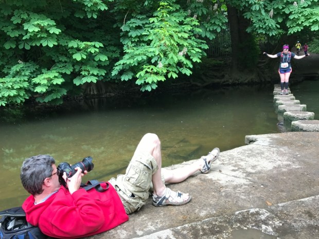 I filled up with water, more Tailwind, PB&J sandwiches & some amazing banana & chocolate cake & headed off for what I thought would be the toughest section of the whole run. I crossed the stepping stones, pausing to smile for Stuart the race photographer, had a few quick words of encouragement from him on the other side & started on the steps up to the top of Box Hill. I was prepared, I knew they were coming, it doesn’t make them any easier!
