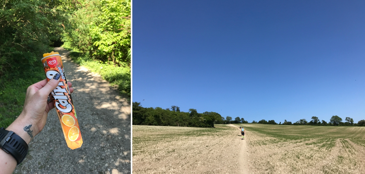 I ran, slowly, into CP 4 at Reigate. The mile of flat, even paths in the run up had been kind to my ankle, it didn’t hurt. Phil Bradburn saw me coming in. We’ve had many a conversation on social media about the virtues of an orange Calippo mid-run on a hot day, he asked if I wanted a Calippo. My face lit up. Did I want a Calippo? YES PLEASE! Phil, I owe you one, the BEST thing ever! I couldn’t possibly drop now I’d got a Calippo… That & Louise Ayling, the CP manager who I know from my Centurion volunteering stints, wouldn’t let me drop! So after some more watermelon off I trotted… I still hadn’t eaten though. I’m not sure if orange ice lollies & watermelon count as food when you’re running 50 miles.