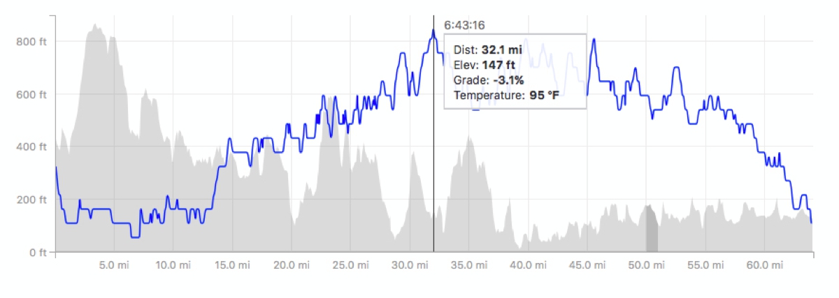 The shaded area shows the elevation & the contrast between the hilly first 50 & the flatter second 50. The blue line indicates temperature. At 32 miles my Garmin recorded 95 Fahrenheit or 35 celsius.