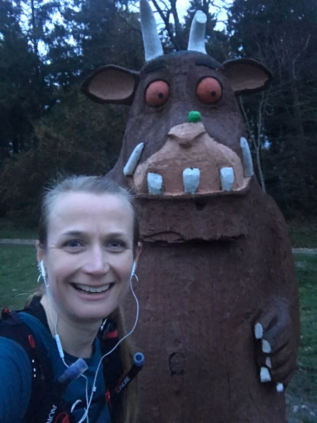 I started my fourth lap still in daylight. I wasn’t expecting this, I was expecting it to be dark by lap four. Though I had no idea what time of day it was, the light was rapidly failing. It gave me a boost to still have some light in the sky for this lap. Now he didn’t have small children climbing all over him I stopped for a quick selfie with the Gruffalo, knowing that it would definitely be dark the next time I passed him.