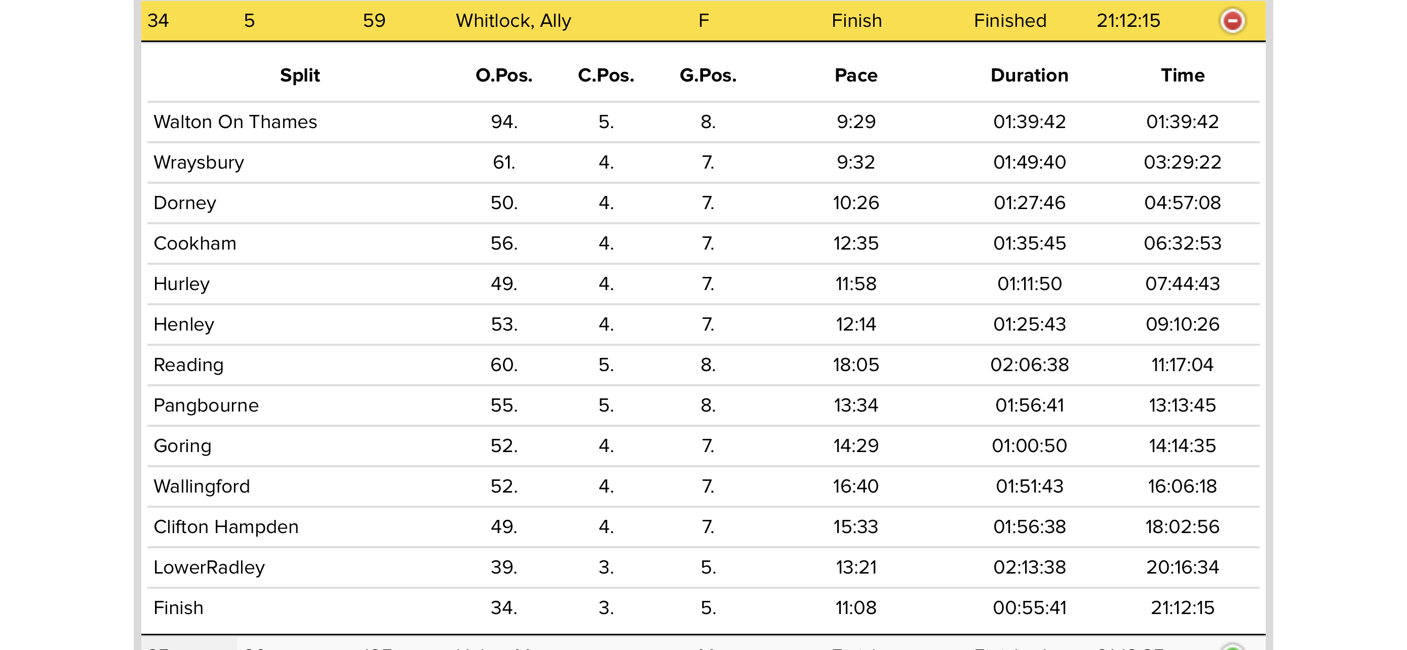 Between Reading & Oxford, I climbed 26 places. I finished the race as 5th lady & 34th overall. 287 runners started, and 203 finished the race. I overtook 26 of them in the last 40 miles. I finished only 72 minutes behind my target. I actually GAINED time in the final third of the race.
