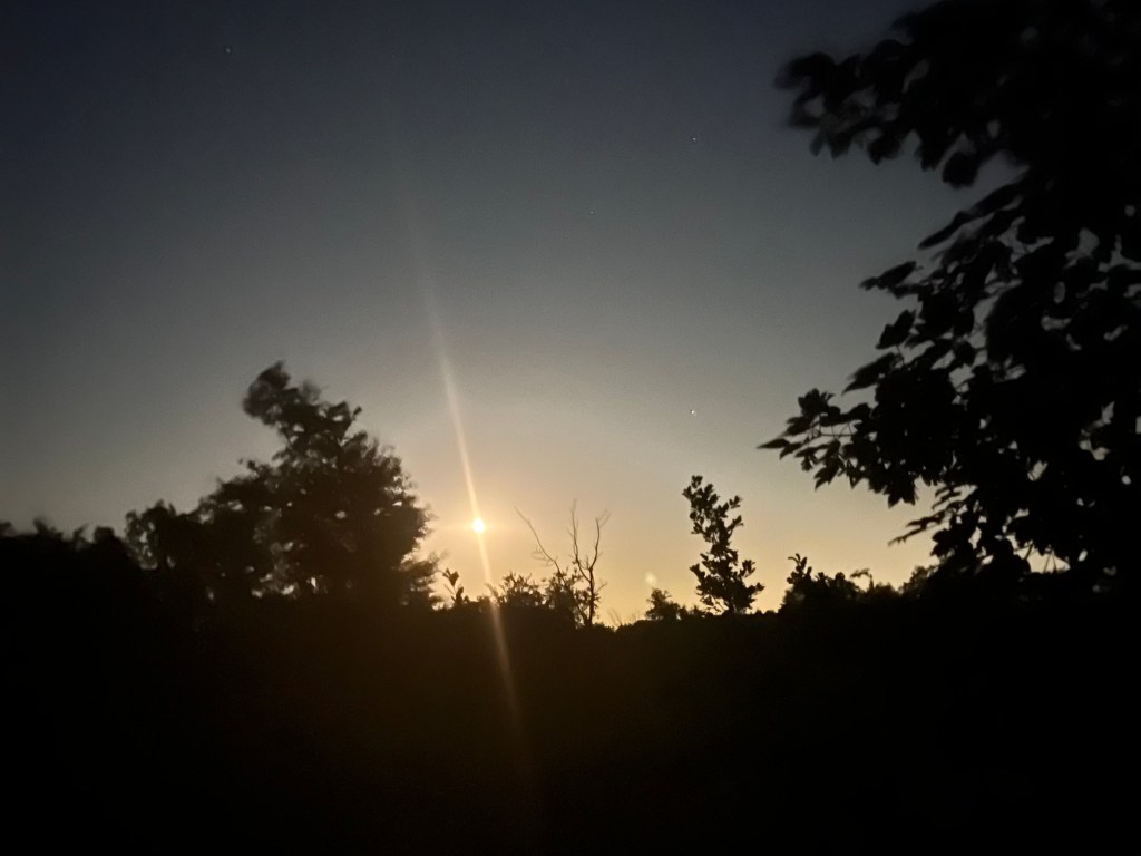 We started lap one under a cloudless blue sky, the blazing hot sun high in the sky. As the laps progress, the light changes from a cool blue to a warm orange. The shadows on the ground lengthen. Patterns of light dance at my feet as the sun, sinking low in the sky, shimmers through the trees. Dusk comes. The sky is golden as the sun slips silently below the horizon, leaving a pinky hue in its wake.