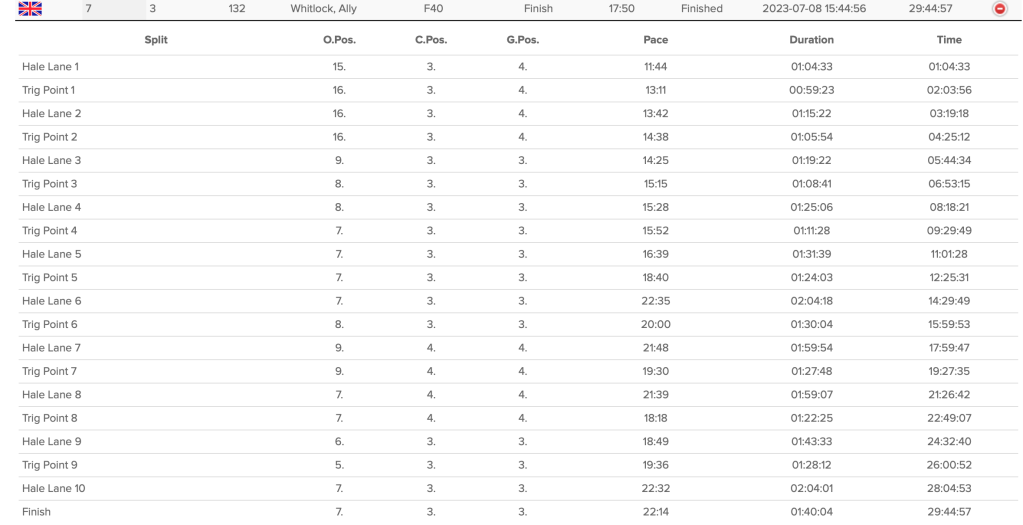 It’s humbling to be lapped by another woman so early on but shows just how good Rachel is. She goes on to break the women’s course record in an astonishing 22:57:13 claiming her victory as I finish my eighth lap. Coming into the trig field a few minutes ahead of her, I am delighted that she doesn’t quite manage to lap me for a second time!