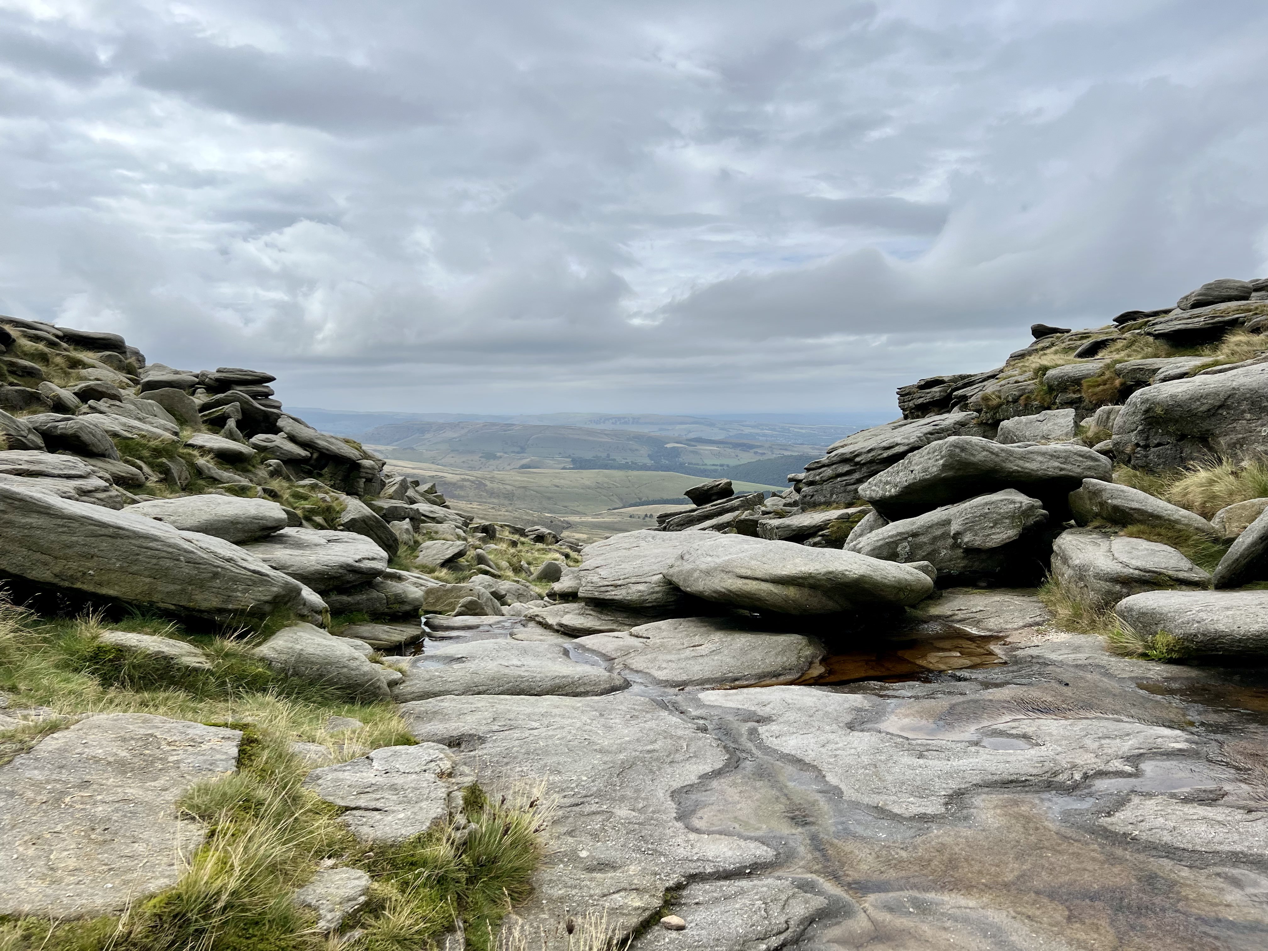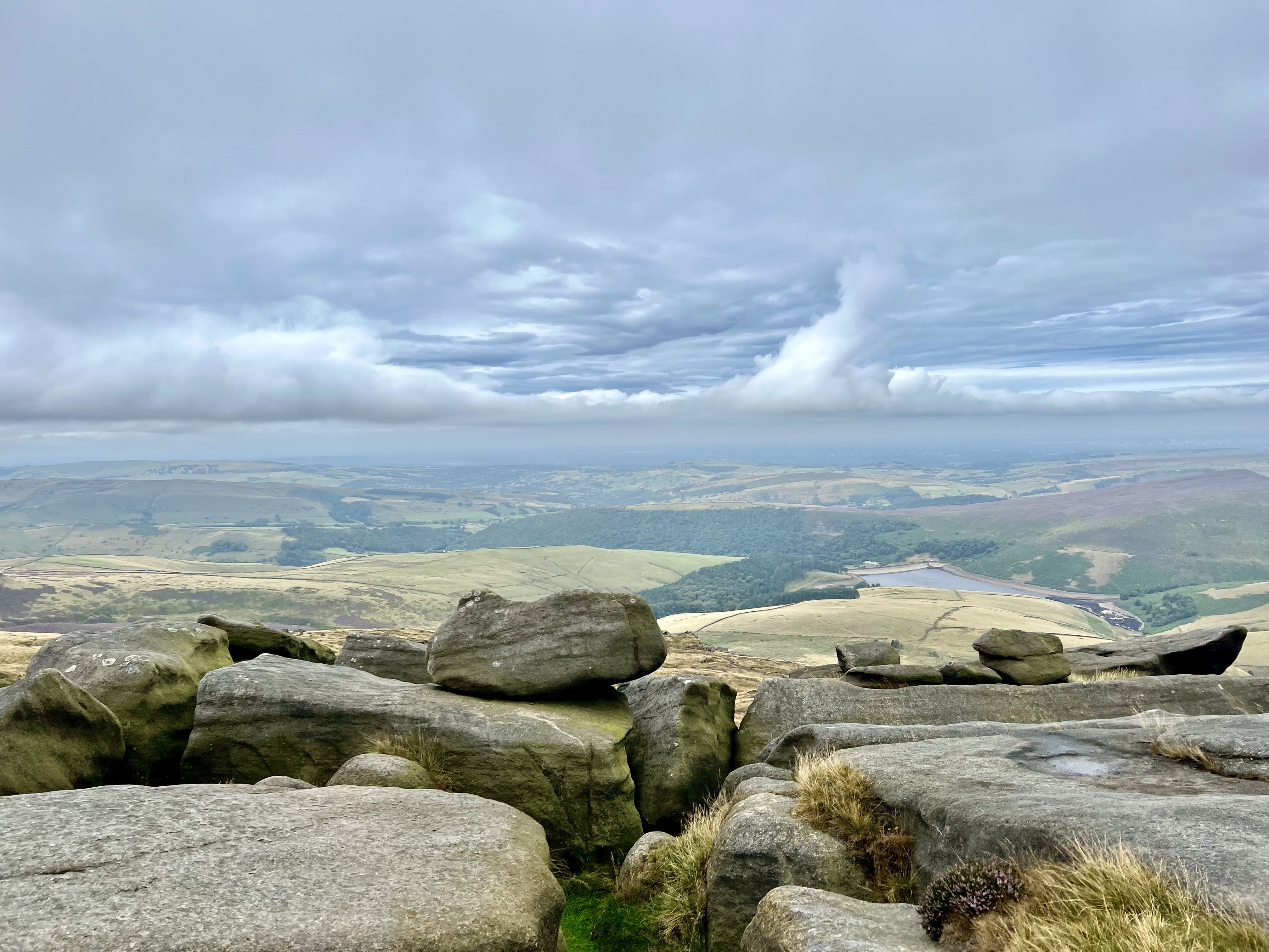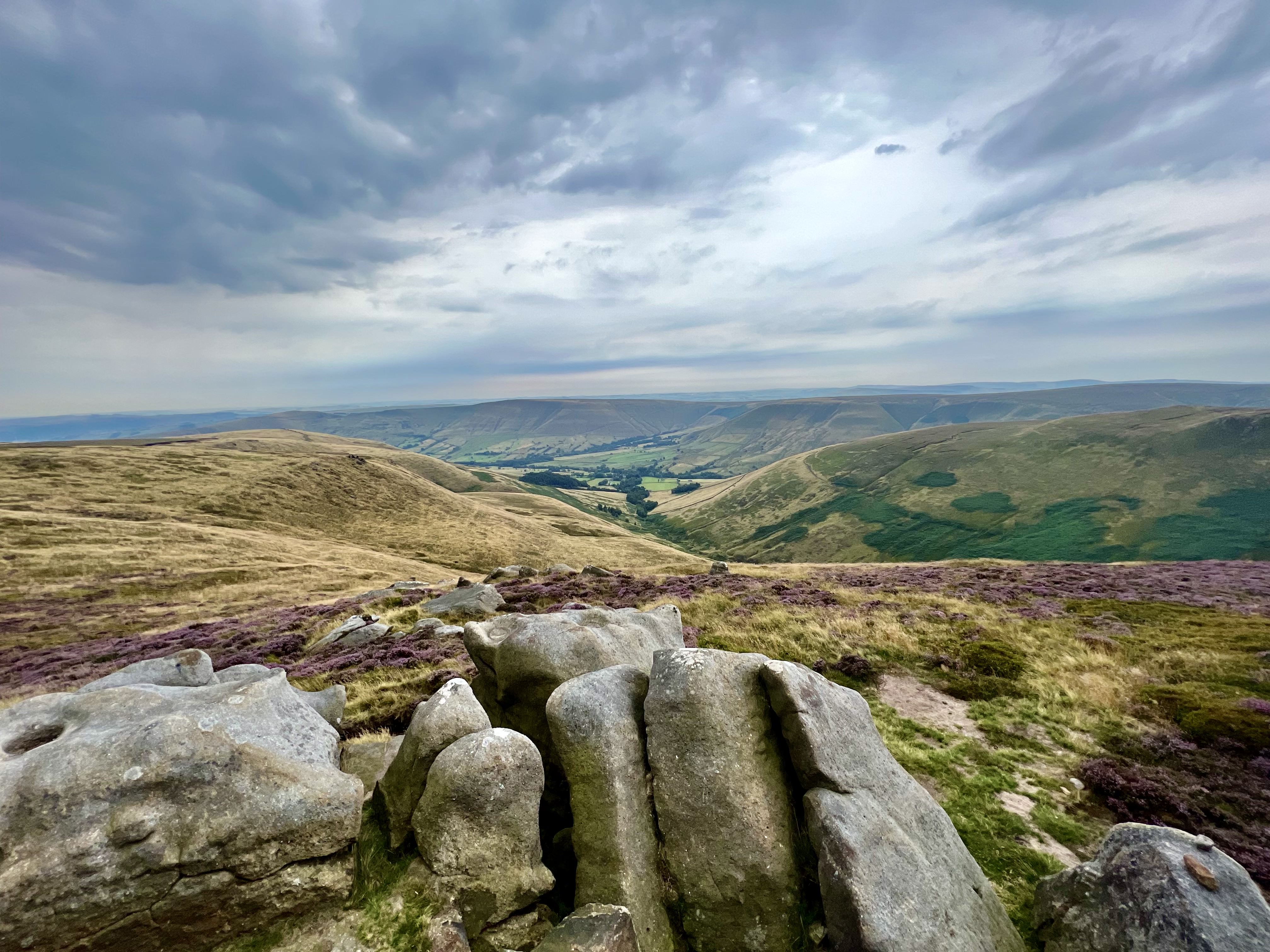 From Edale, I go straight into a lung-busting climb up to Ringing Roger. The path is a simple worn grove between the multitude of rocks. I jump over small gorges. In the winter they would be gushing waterfalls but in the heat of the summer, there is barely a trickle of water. I pull myself over large rocks & turn to watch the remnants of a cloudy sunrise light up the valley behind me.