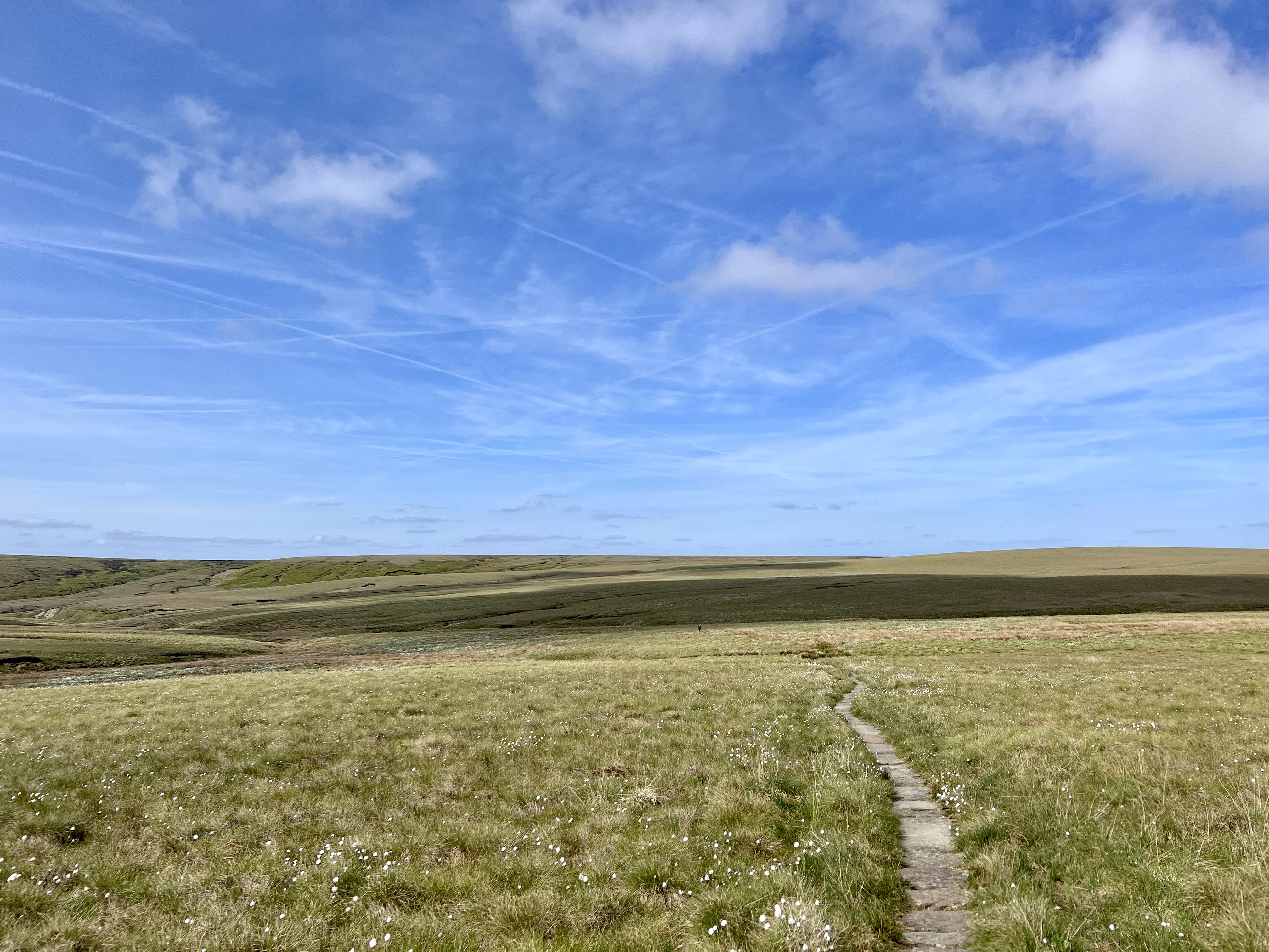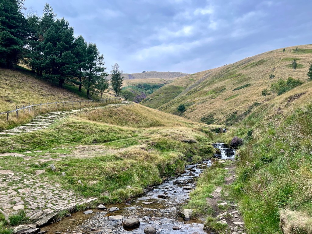 I crossed Kinder Downfall, the magical waterfall where when conditions are right, the water blows back on itself, creating a steam cloud that can be seen from miles around. Today, it was just an ordinary stream. Then, midway along the flagstone path leading to Snakes Pass – and having already sneaked in a couple of extra miles – I reluctantly turned to make my way back towards Edale & the train back to real life.