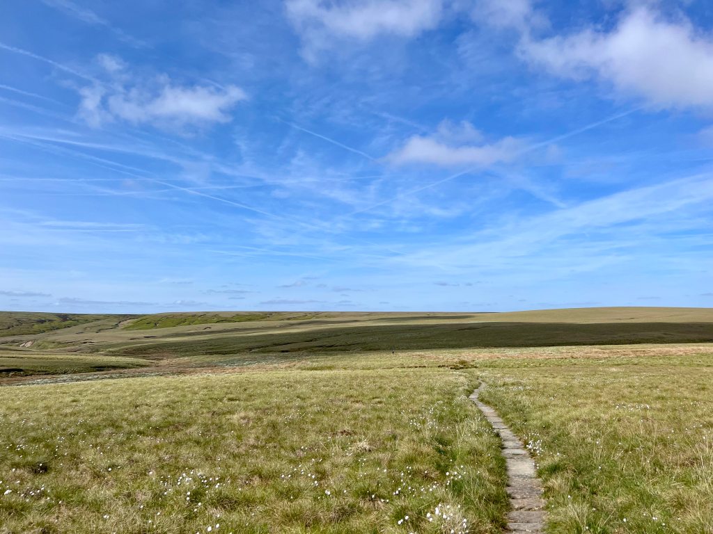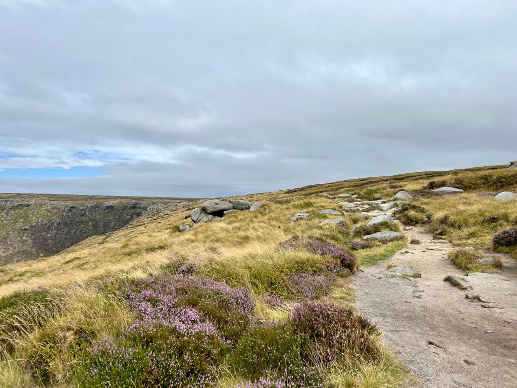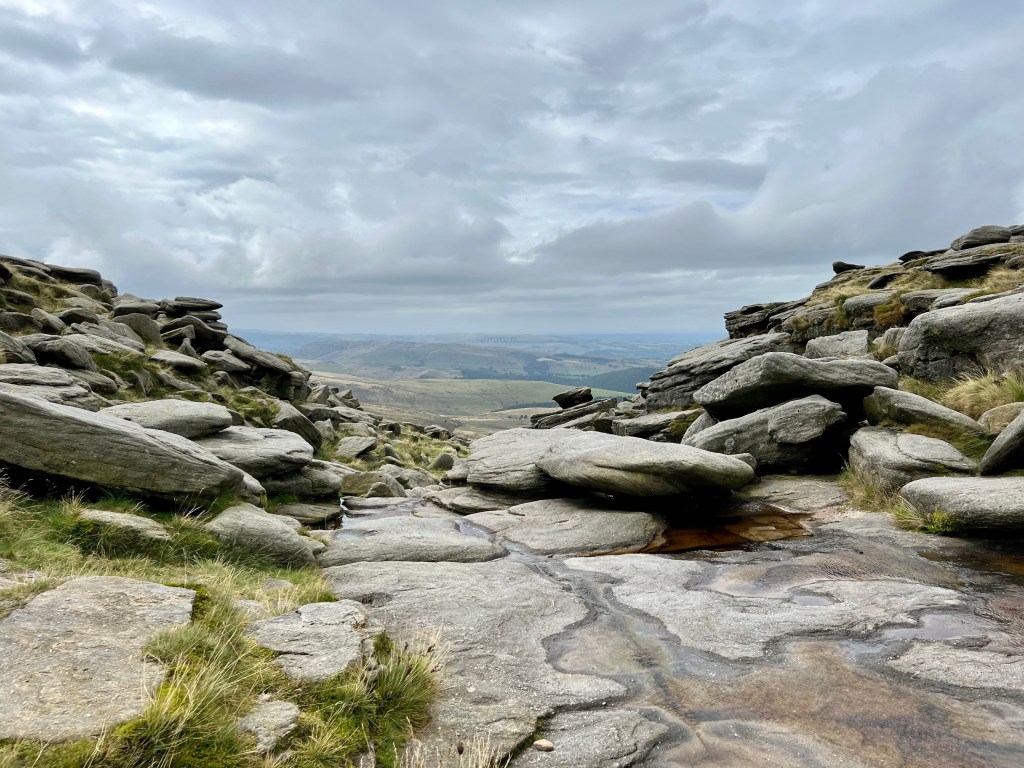 I settle into my grove dancing along the path, letting my feet follow the worn grove between the rocks. The rain has stopped & the sun is threatening to break through the clouds. I remember the joy I felt here last summer & I can’t help but smile. Past Edale rocks & the trig at Kinder Low. The path is just as I remember it & I scamper along it with glee.