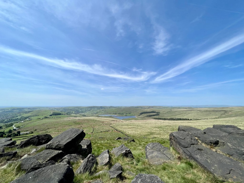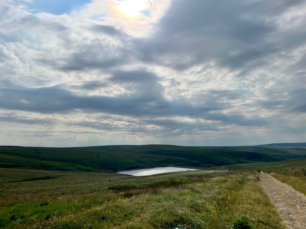 Heading down the hill from Blackstone Edge I pass 8, 10, 12, maybe more Challengers. They cheer me on as I trot (no longer flying) down the rocky descent & cross the road towards the reservoirs.