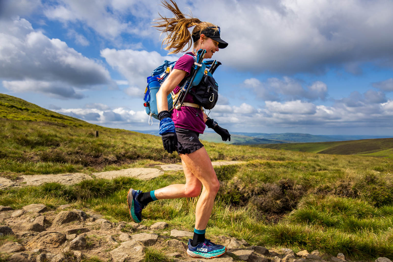 The opening miles ease us in. The trail undulates through lush, green fields, cradled between steep hillsides & winding cloughs in the Vale of Edale. To the right, the slopes of Grindslow Knoll rise sharply above us. To the left, the Great Ridge stretches across the skyline, familiar & reassuring. The ground is soft, forgiving, almost encouraging. It would be easy to let the excitement take over.
