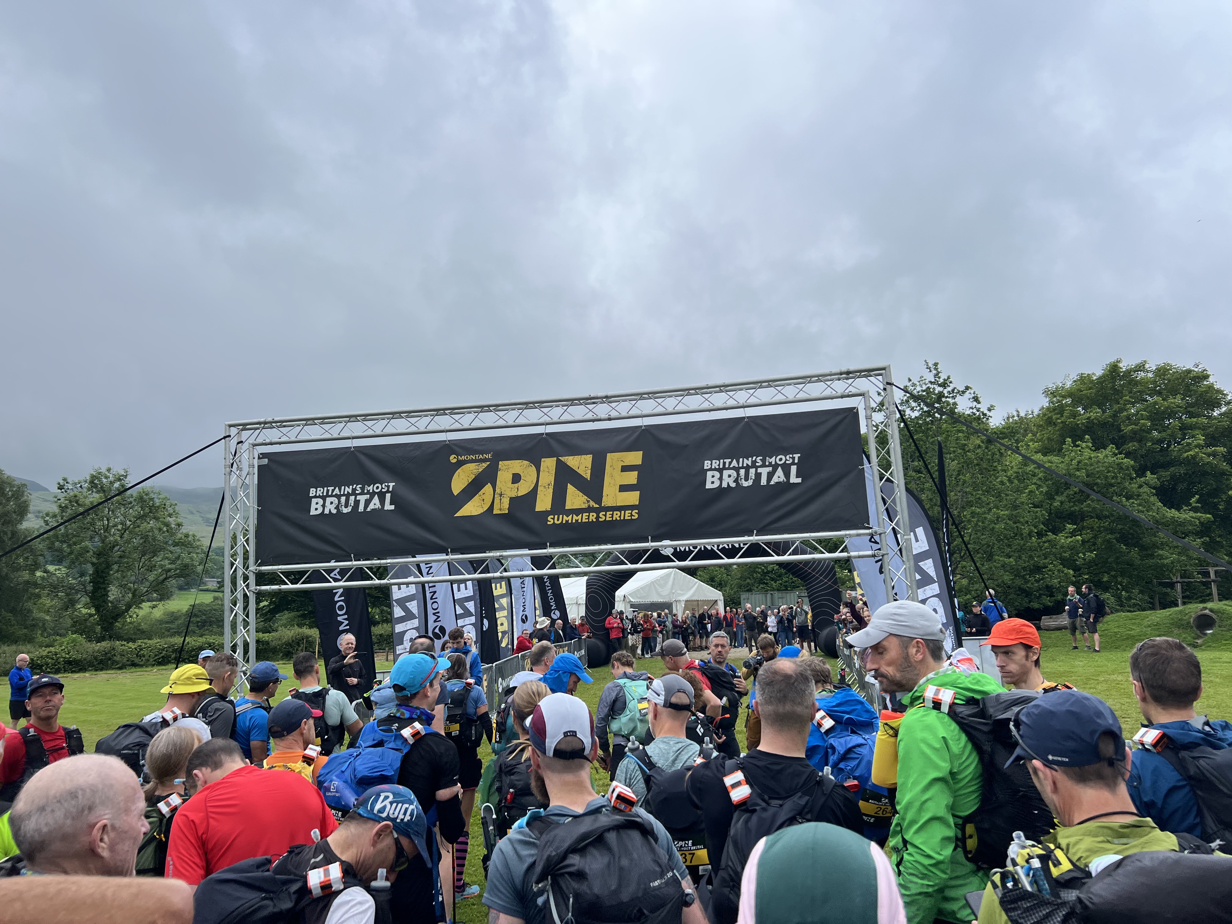 Now, coffee from the café in the station in hand, I sit on the ground outside the village hall, aka Spine HQ, eating my pre-race breakfast from a Tupperware box. I watch the sky nervously as the heavens open. I was hoping the threatening grey clouds would blow over without delivering on their promise. Instead, I pull on my waterproof & dash for cover beneath the small marquee on the starting field.