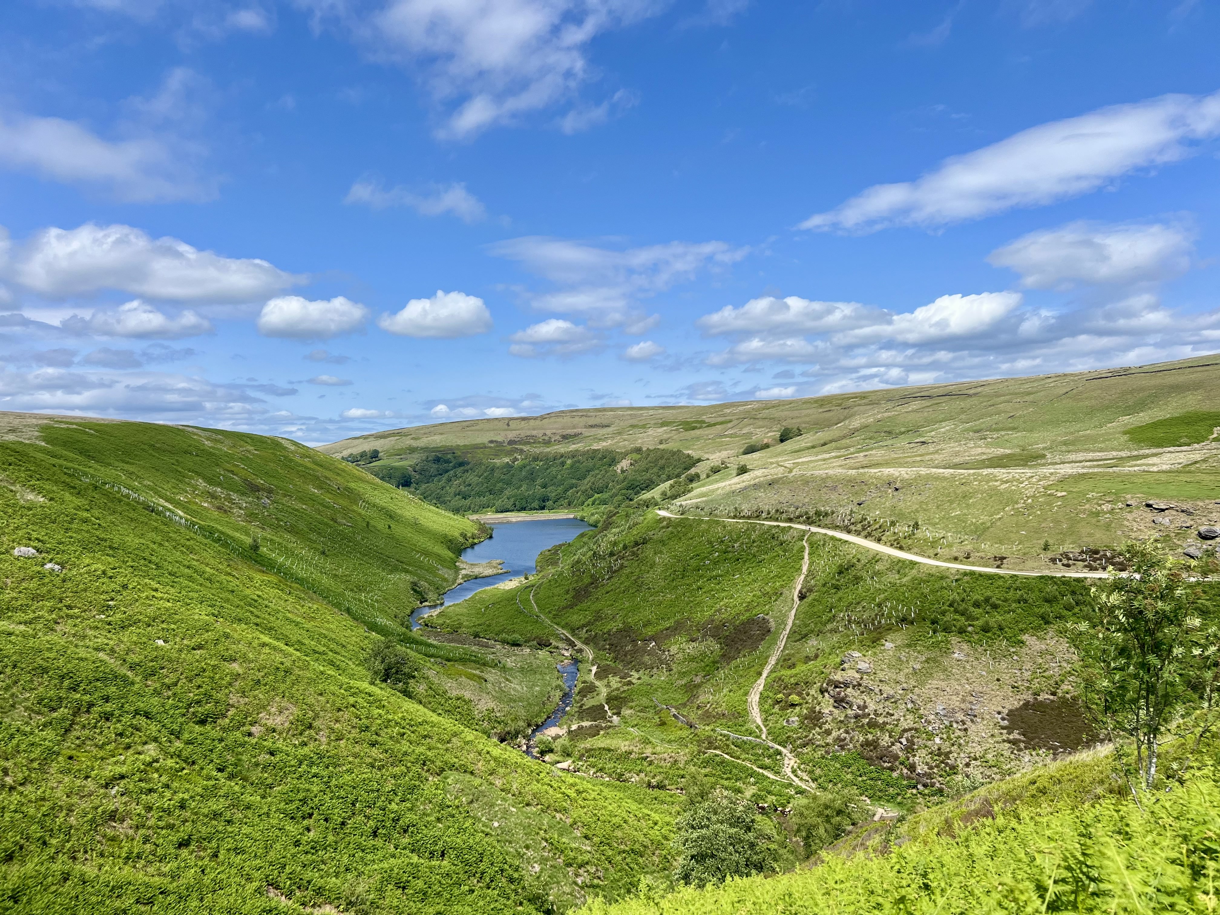 With the sun now blazing & the earlier cloud cover all but gone, the views across Torside Reservoir are spectacular. I slow, stop briefly & take a couple of photos.