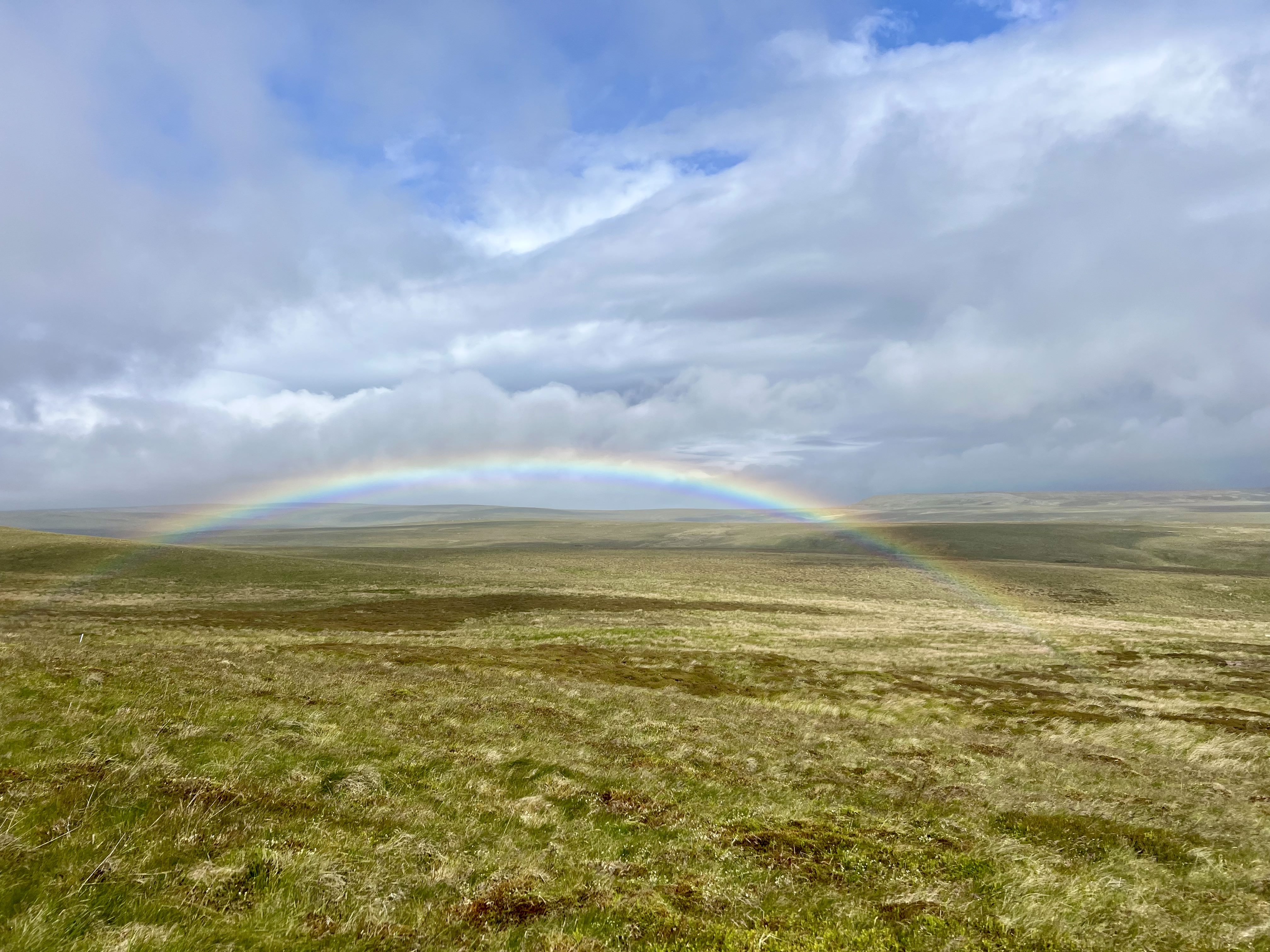 A brief, half-hearted rain shower, not worthy of the waterproof, breaks my stride as I pause to admire a spectacular rainbow stretching from one side of the moor to the other.